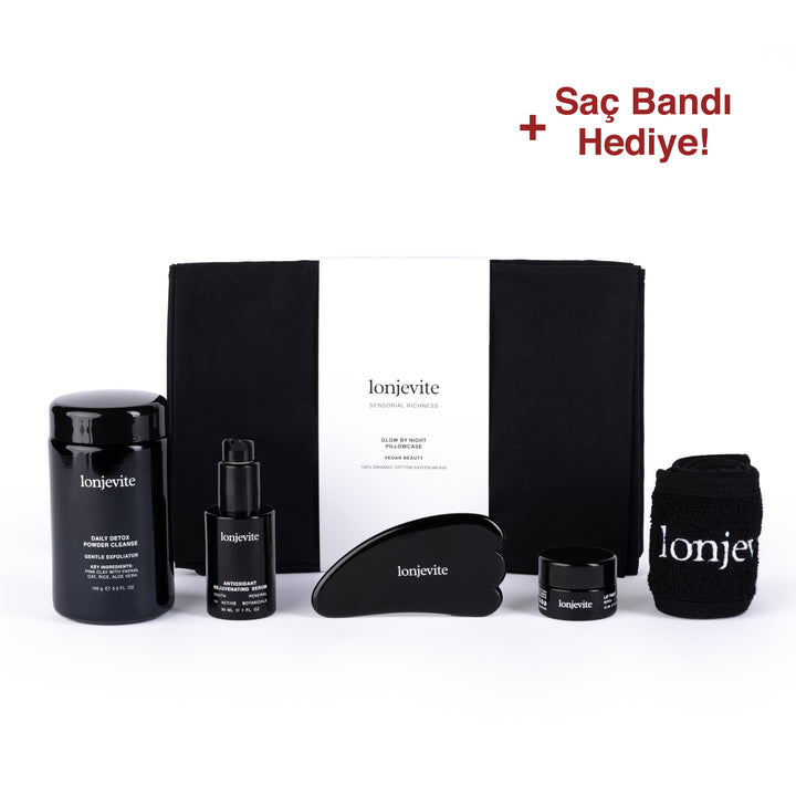 Set İçeriği: Daily Detox Powder Cleanse 100 g, Antioxidant Rejuvenating Serum 30 ml, At-Home Spa Headband, Black Obsidian Gua Sha, Lip Treat 10 ml, Glow by Night Satin Pillowcase